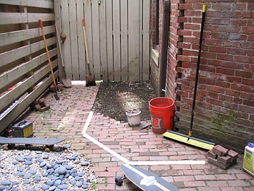the dirt finally gone, I laid brick in part of the area (demarcated by