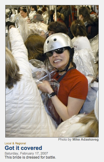 The Learning Channel is making a documentary on the legendary “Running of the Brides” event at Filene’s Basement, and blushing bride-to-be Mandie was chosen as one of three brides featured in the show. See her audition tape here (produced by yours truly). So on February 16, 2007, Mandie and her loyal comrades lined up outside Filene’s Basement around 5 a.m. to be on the front line of the Battle of the Brides. Doors opened after three long, cold hours of waiting. Within minutes, thousands of wedding dresses were stripped from the racks by rabid brides and their equally rabid bridesmaids.